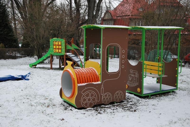 Przedszkole otacza duży ogród, podzielony na trzy zielone sale, osobne dla każdej grupy wiekowej, wyposażony w atrakcyjne, nowoczesne urządzenia wolnostojące do zabaw dla dzieci.