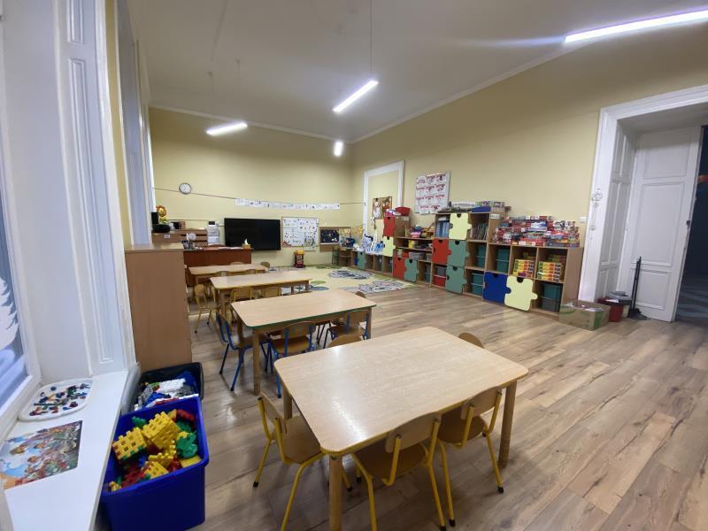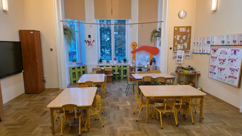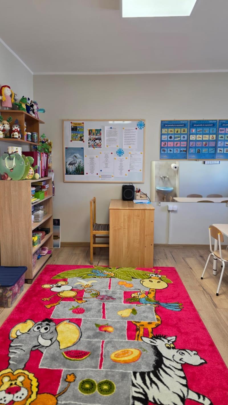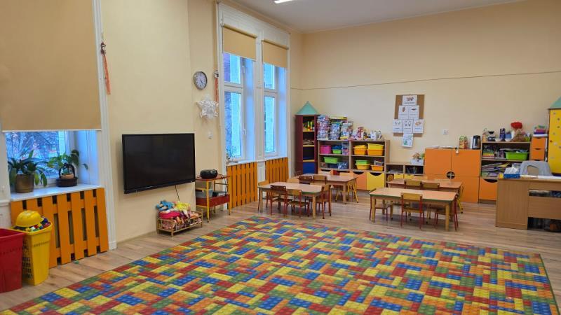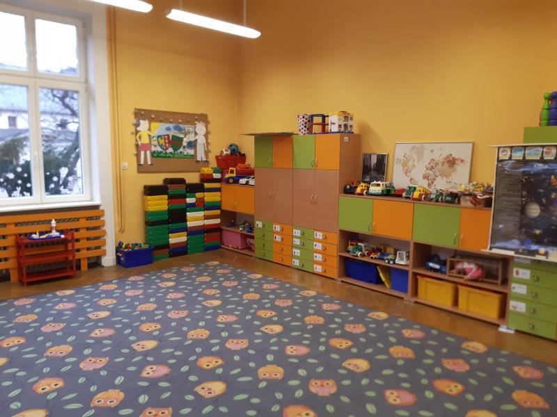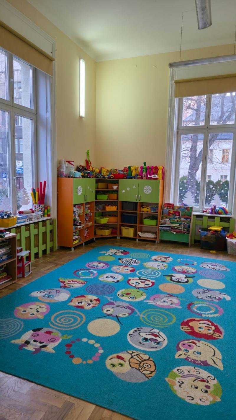 Budynek jest w pełni dostosowany do potrzeb i możliwości dzieci. Duże, jasne i przestronne sale zabaw wyposażone są w trwałe, bezpieczne zabawki i pomoce dydaktyczne dostosowane do wieku i zainteresowań dzieci. Kąciki zabaw zapewniają dzieciom różnorodną działalność, oraz inspirują do prowadzenia własnych eksperymentów i twórczej aktywności.