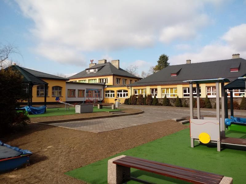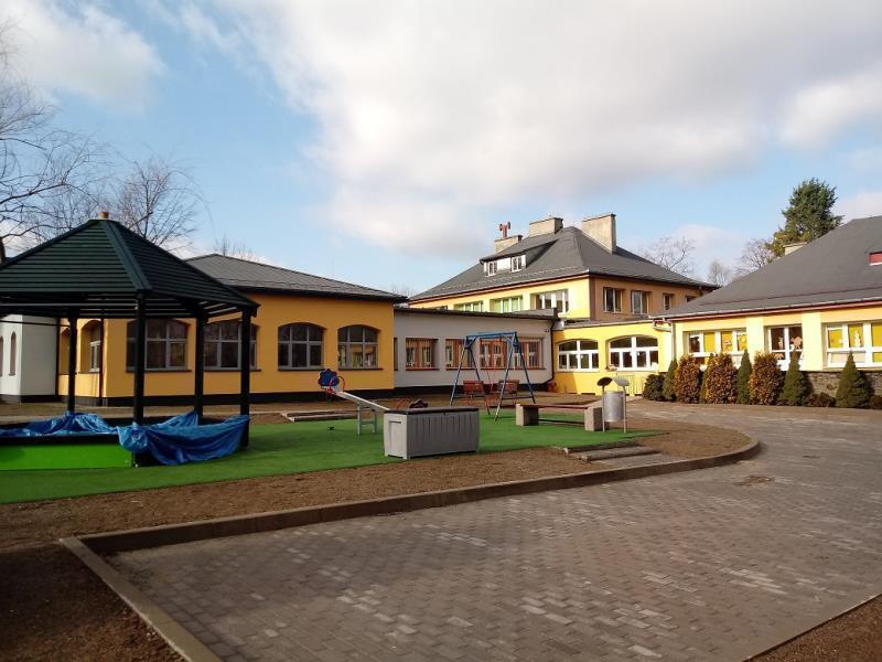 - podjazd dla osób niepełnosprawnych od strony ogrodu z tyłu budynku , przez nową część przedszkola,